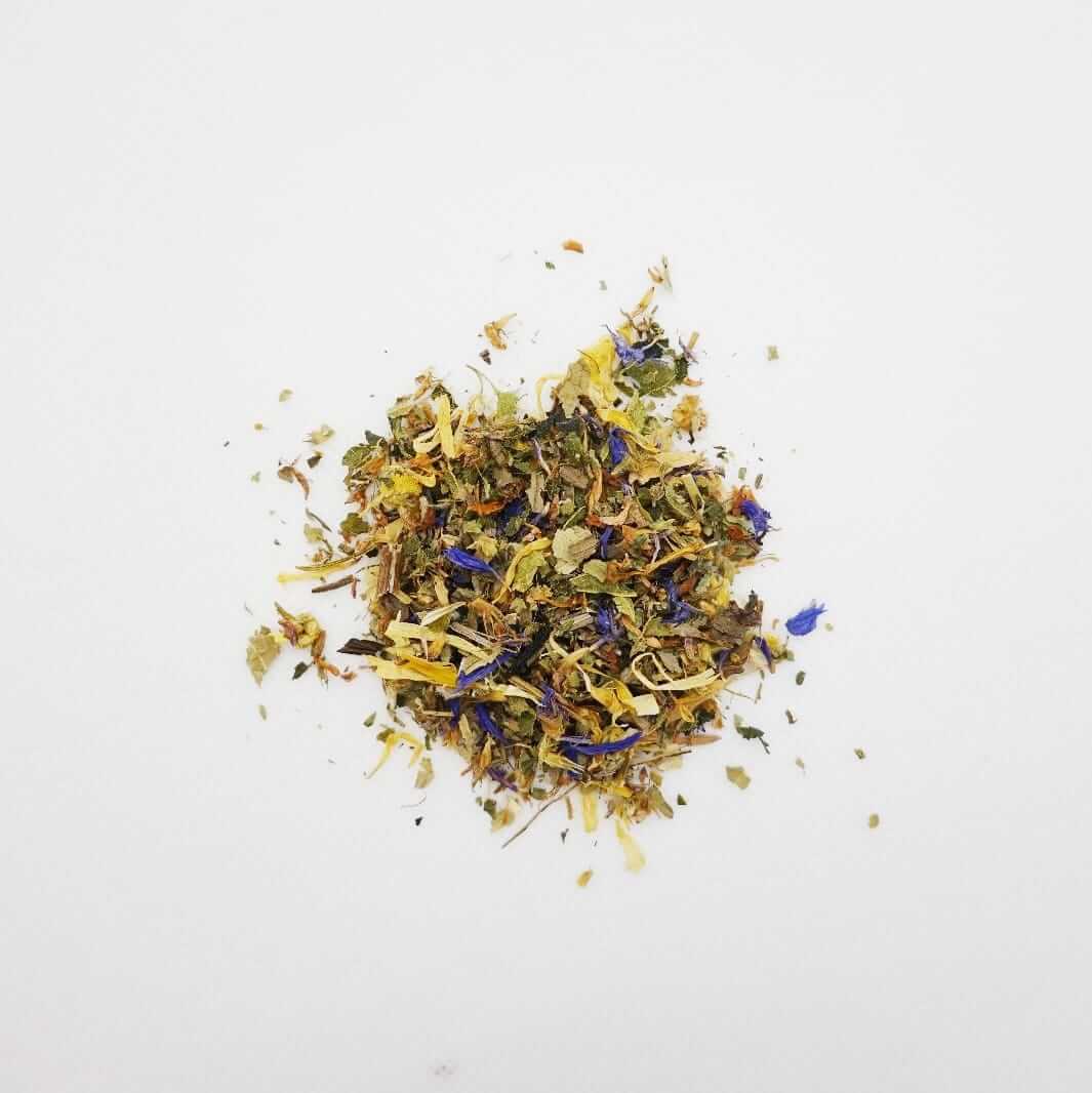 Zutaten: Rotkleeblüten, Brennnesselblätter, Frauenmantel, Spitzwegerich, Kamillenblüten, Kornblumenblüten